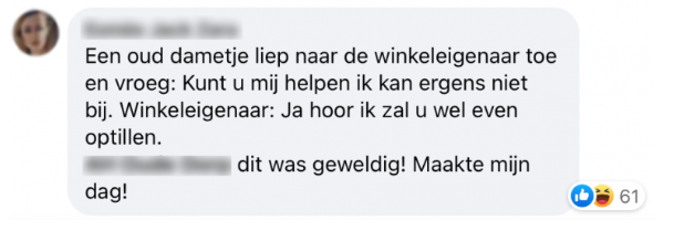 Ik ging brood kopen, maar het hele schap was leeg. Ik vroeg aan de vakkenvuller waarom dat schap leeg was en hij zei: ‘Geen idee, maar weet je welk schap nooit leeg is? Vriendschap.’ En hij reikte me een zak krentenbollen aan. De meeste mensen deugen.