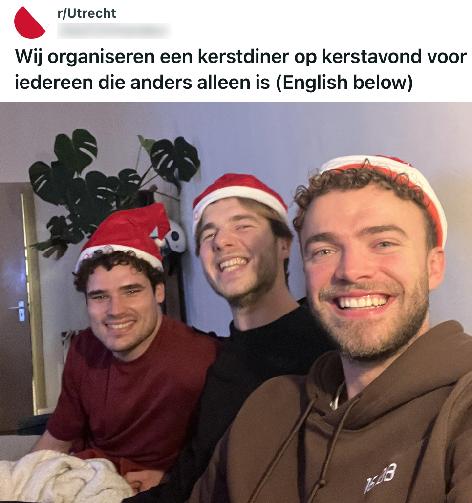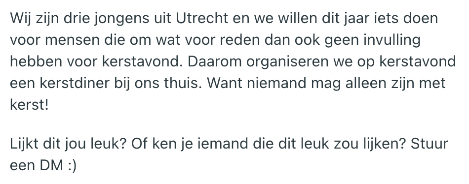Voor veel Nederlanders betekenen de kerstdagen een overvolle agenda: etentjes bij je eigen familie, je schoonfamilie, aangetrouwde familie, je gescheiden vader en z’n jonge vriendin en tussendoor ook nog met vrienden. Maar zulke volle dagen zijn lang niet voor iedereen vanzelfsprekend. Ouderen of mensen die net in Nederland wonen, brengen de kerstdagen vaak alleen door. Omdat niemand kerstavond in z’n eentje zou moeten vieren, organiseren drie jongens uit Utrecht een kerstdiner voor iedereen die anders alleen zou zijn. Een initiatief dat online minstens zo warm wordt ontvangen als de Viennetta aan het eind van de avond.