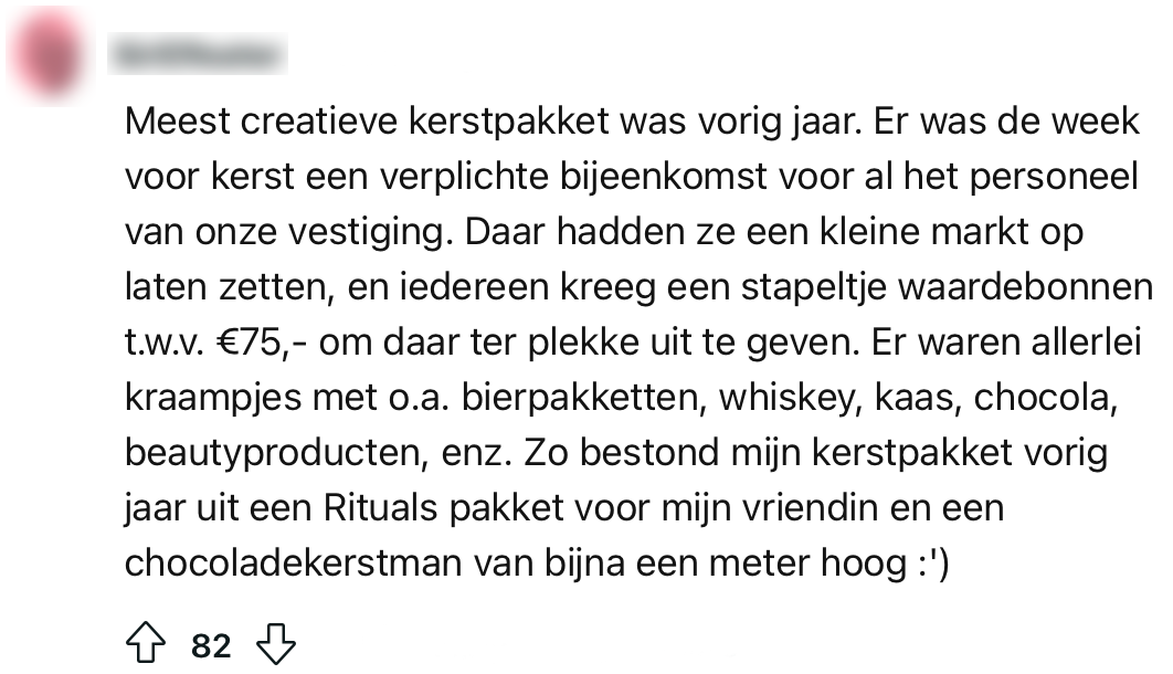 Voor veel werkende mensen betekent kerst ongeduldig en nieuwsgierig wachten op je kerstpakket. Tegenwoordig is het echter niet altijd meer de standaard doos met boodschappen die je nooit zelf in huis zou halen, maar krijg je in plaats daarvan bijvoorbeeld een Bol-cadeaukaart. Een Reddit-gebruiker vraagt zich af wat de leukste kerstpakketten zijn geweest die mensen ooit hebben ontvangen en de creativiteit spat van het scherm.