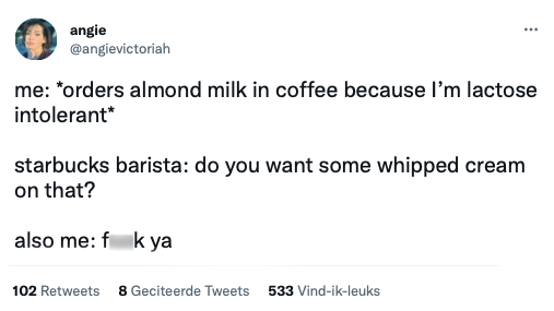 Als je lactose-intolerant bent, kun je maar kleine hoeveelheden lactose verdragen. Dit zit vaak in zuivelproducten zoals kaas en melk. Daarom drinken sommige mensen dus bijvoorbeeld havermelk in plaats van koemelk. Maar als je op social media kijkt, blijkt dat deze mensen vaak ‘kieskeurig’ lactose-intolerant zijn. Want ja, die slagroom bovenop je havermelk frappuchino is toch wel lekker.