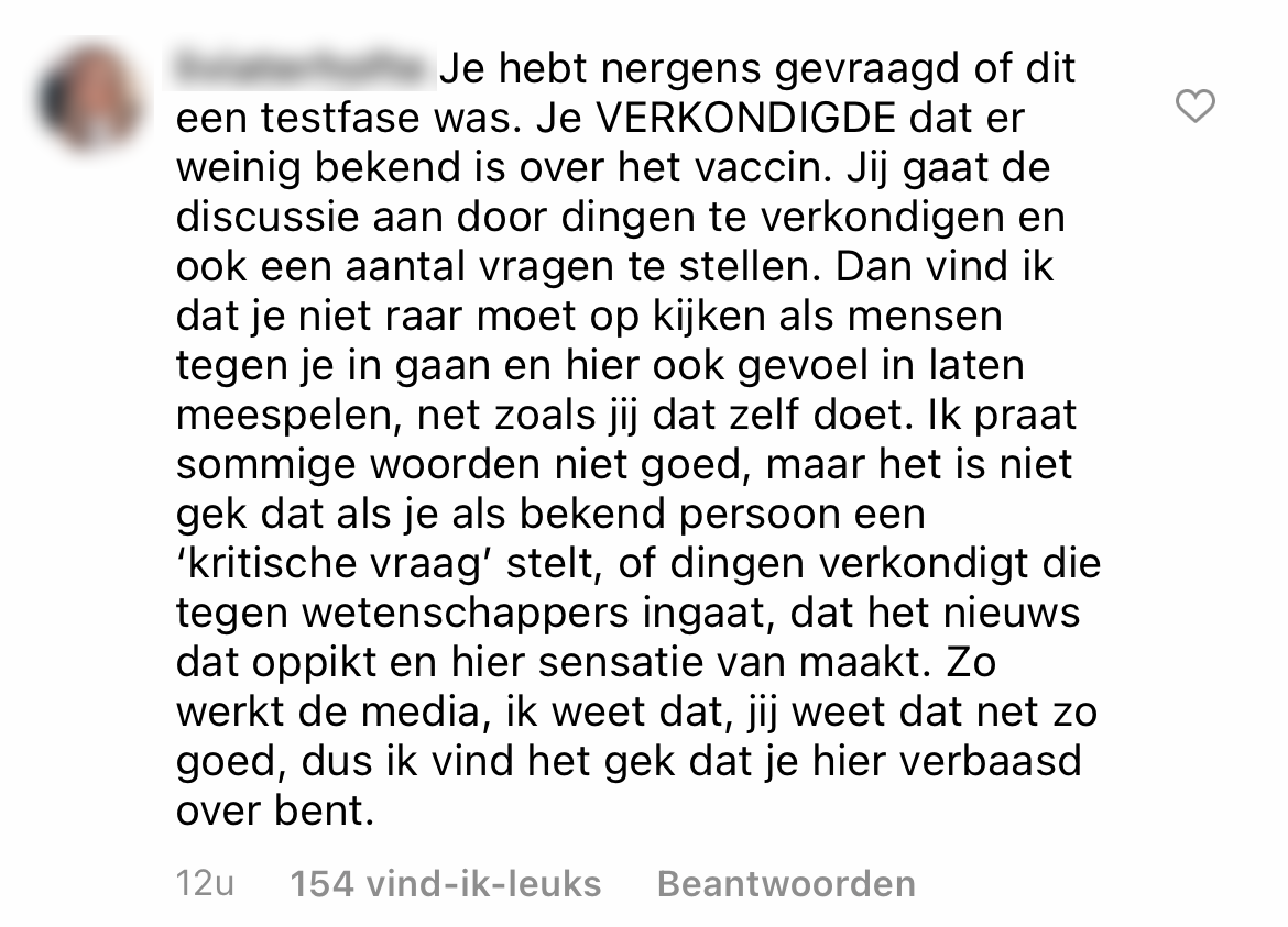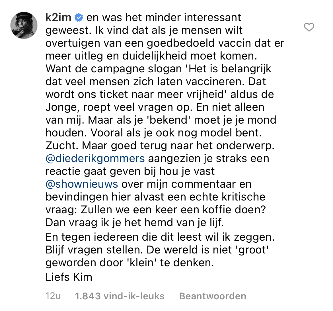 Onlangs pikte de media de Instagram Stories op van Kim Feenstra, waarin zij zich uitliet over de publiekscampagne over de vaccinaties tegen het coronavirus. Kim benadrukt dat ze niet tegen vaccinaties is, maar dat ze zich niet kan vinden in de boodschap van de publiekscampagne, waarin gezegd wordt dat zoveel mogelijk mensen zich moeten laten vaccineren. ”Dat wordt ons ticket naar meer vrijheid”, luidt de campagne. De media pakt het op en dat is voor Kim een reden om nogmaals een bericht op Instagram te plaatsen waarin ze duidelijk wil maken dat ze géén anti-vaxxer is, maar wel haar vragen heeft bij de campagne.