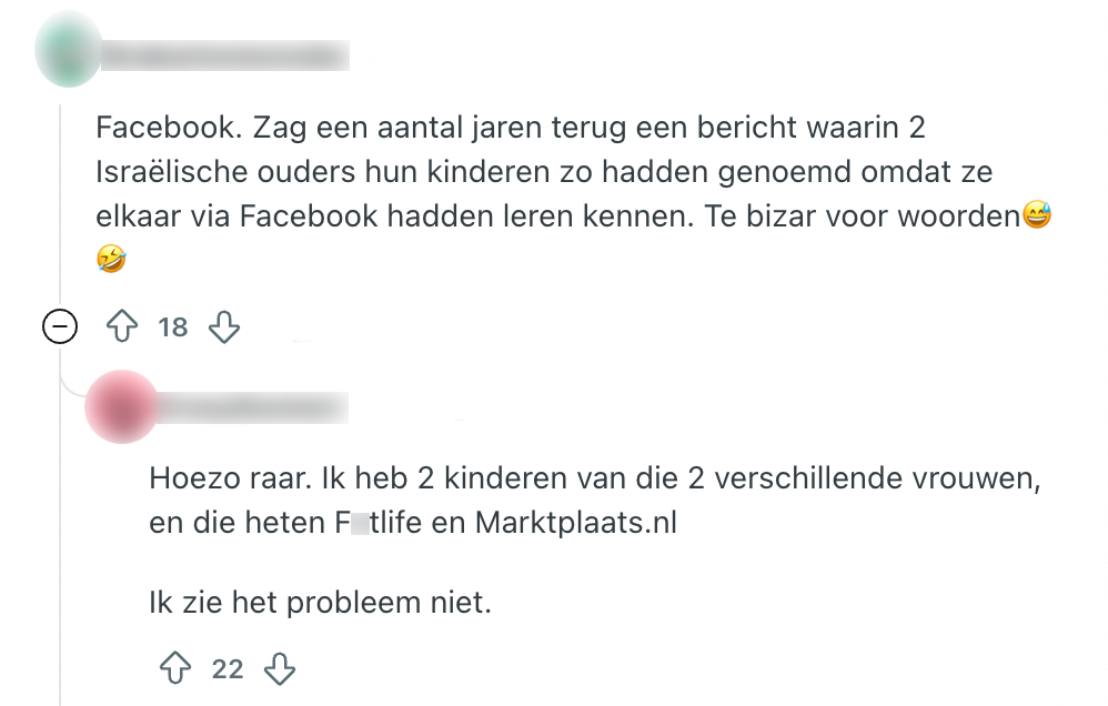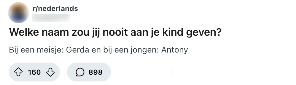 Je hebt heel lang moeten wachten, allerlei voorbereidingen getroffen en onderzoek gedaan, en eindelijk is het zover: je kindje is er. Bij zo’n speciaal moment hoort natuurlijk ook een speciale naam. Maar lang niet alle kindernamen worden gezien als leuk of origineel. Een Reddit-gebruiker vraagt andere Nederlanders naar namen die zij hun kinderen nooit, maar dan ook nóóit zouden geven en dat levert een hoop reacties op.