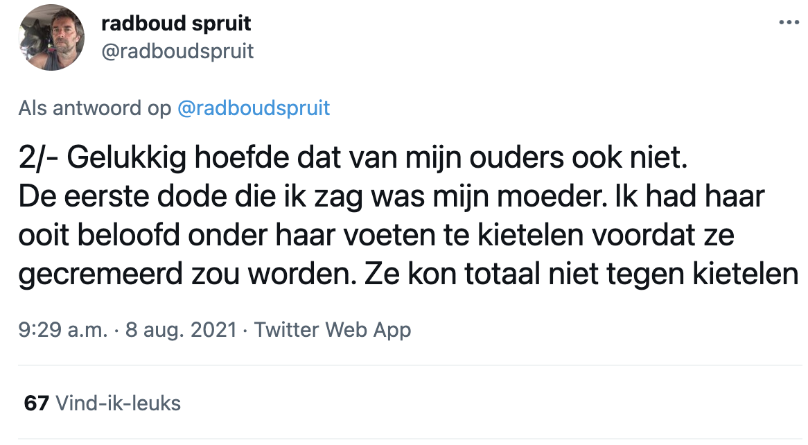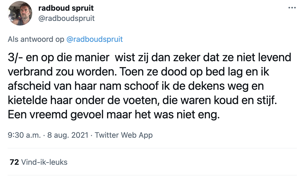 Een vrouw lag al een week opgebaard in bed op zolder. Ik bezorgde de kist aan huis. De uitvaartbegeleider vroeg of ik wilde meehelpen de vrouw naar beneden te dragen, de kist naar boven was onmogelijk.— radboud spruit (@radboudspruit) August 8, 2021