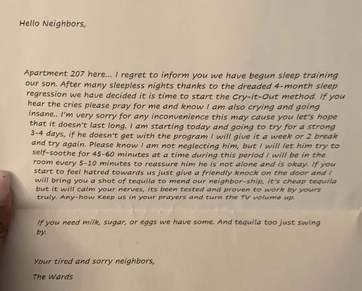 Buren: je kunt het met ze vinden of totaal niet. Het is wel altijd fijn als ze je op de hoogte brengen van eventuele feestjes of als ze besluiten de badkamer te verbouwen, zodat je weet dat je herrie kan verwachten. De buren van de Amerikaanse Kitty lieten ook een briefje voor haar achter, om alvast sorry te zeggen voor de komende paar nachten.
