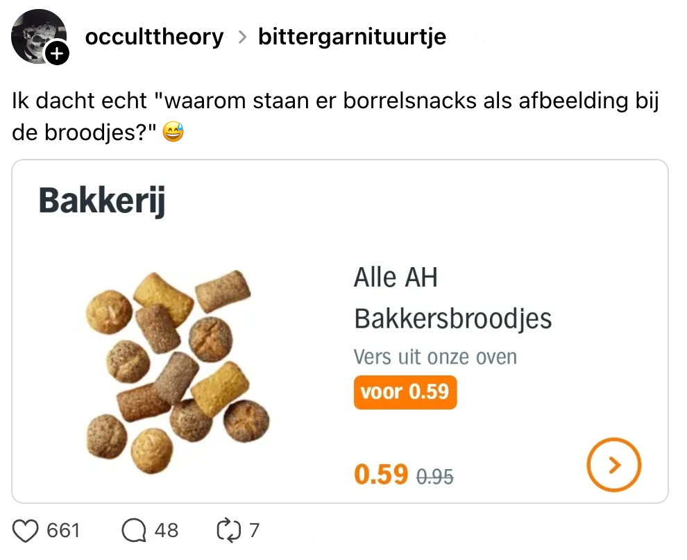 Voordat je boodschappen gaat doen, is het handig om eerst even naar de aanbiedingen te kijken. Zo weet je precies wat je moet inslaan om de komende weken weer vooruit kunnen. Ook deze klant neemt een kijkje bij de aanbiedingen in de Albert Heijn-app en wil het bijna van de daken schreeuwen wanneer ze borrelsnacks in de bonus ziet. Maar niets is minder waar: de overheerlijke snacks blijken een heel ander product te zijn…