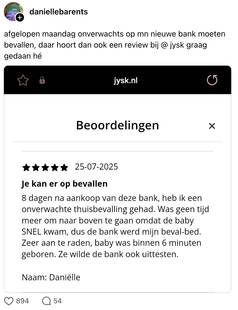 Een bevalling is niet niks. Het is dan ook logisch dat je er alles aan doet om jezelf er zo goed mogelijk op voor te bereiden. Zo kun je cursussen volgen en regelmatig met een verloskundige praten. Maar zo’n bevalling loopt niet altijd zoals je verwacht. Daniëlle kon door tijdgebrek niet anders dan thuis, op een gloednieuwe bank van Jysk, bevallen. Niet de meest ideale plek, maar gelukkig liep alles goed af. Daarna besluit ze een review op de website van Jysk achter te laten, en daardoor komen lezers niet meer bij.