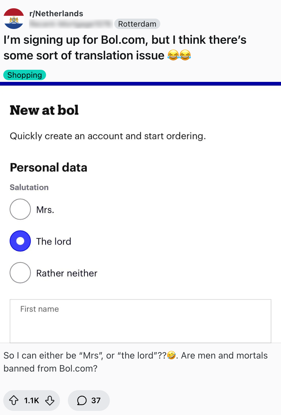 Online bestellen is tegenwoordig de normaalste zaak van de wereld. Voor je het weet heb je een glow-in-the-dark-aambeienzalf, een budgetproof fatbike en een jaarvoorraad pinda’s in je mandje gegooid. Alleen nog even afrekenen, en klaar is Kees. Maar om je bestelling volledig af te ronden, heb je vaak wel een account nodig bij de desbetreffende winkel. Déze Reddit-gebruiker maakt er één aan bij bol. Diegene vertaalt de webpagina naar het Engels, en ziet dan een komische antwoordoptie bij een vraag over de gewenste aanhef staan.