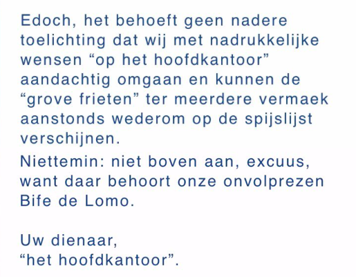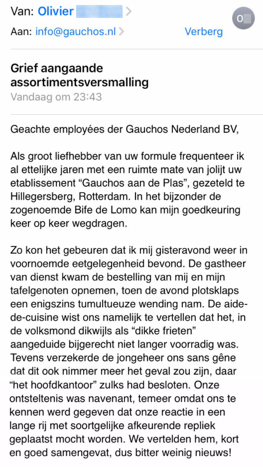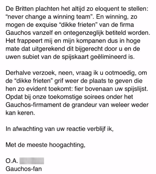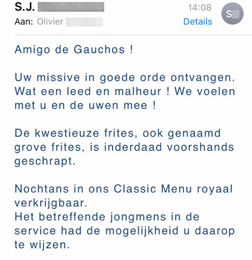 Mijn favoriete steakrestaurant #Gauchos bleek opeens de “dikke frieten” van de kaart geschrapt te hebben. Dat kon ik natuurlijk niet laten gebeuren, dus stuurde ik een simpel mailtje naar het hoofdkantoor. Het antwoord van de directeur (!) is briljant 💯 #grief #goudgelehesjes pic.twitter.com/WXw7vXamJ6