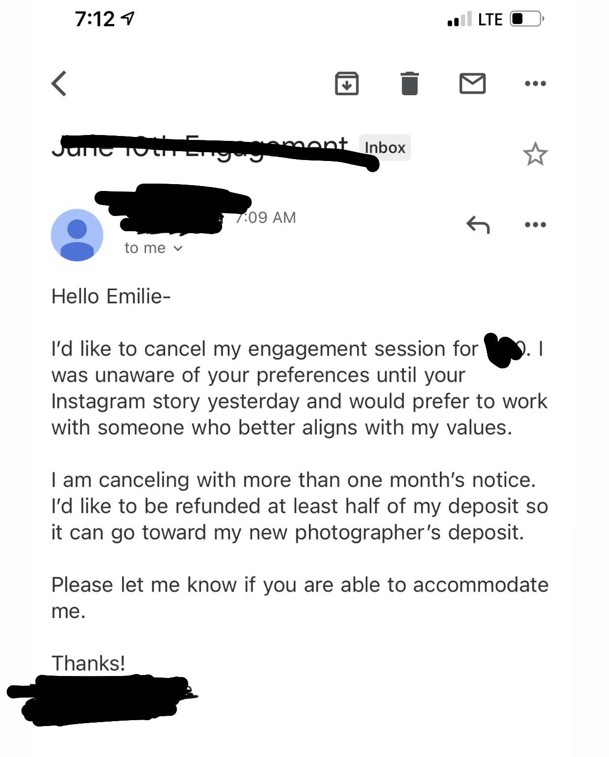 Uitkomen voor je seksuele geaardheid is nog altijd lastig voor veel LGBTQIA+’ers. Wellicht vooral uit angst voor de reacties van anderen. Emilie plaatst op #LesbianVisibilityDay een foto in haar story, waarin ze uitkomt voor haar geaardheid. Als reactie krijgt ze op haar mail echter wel een heel bizarre reactie van één van haar klanten die ze heeft als fotograaf. Ze deelt de vreemde gewaarwording op Twitter.