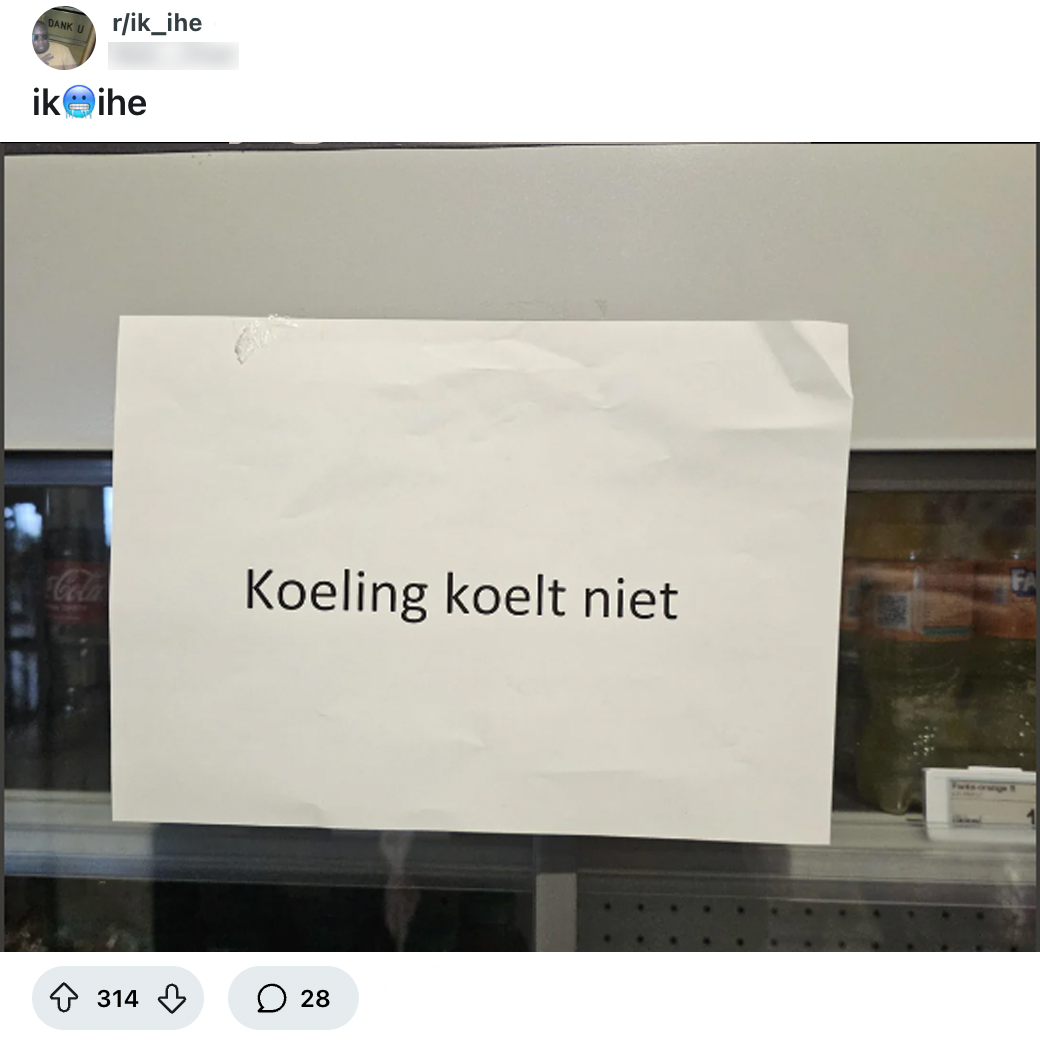 In de supermarkt vind je onwijs veel handige apparaten die je eigenlijk niet meer kan missen, zoals de statiegeldautomaat, de weegschalen op de groenteafdeling en natuurlijk de zelfscankassa. Je moet dan wel duimen dat die machines werken, want het komt regelmatig voor dat ze kapot gaan. Ook deze koeling moet aan een defect geloven en de supermarkt besluit het op te lossen door dit briefje op te plakken. Sommige Nederlanders zien de humor er wel van in en reageren koel.