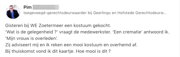 Het zijn vaak de kleine, persoonlijke gebaren die het verschil maken in de klantenservice. Dat bewees kledingwinkel WE met een bijzonder kaartje, dat een diepe indruk maakte op Pim – die op dat moment door een moeilijke periode ging. Hij deelde het op LinkedIn en raakte daarmee nog veel meer mensen. Eén ding is zeker: voor Pim is dit een moment dat voor altijd in zijn geheugen gegrift staat.
