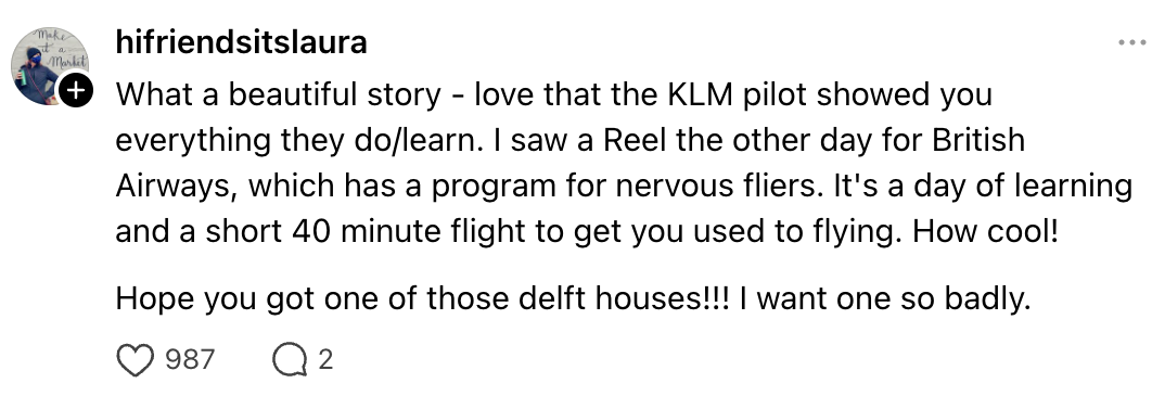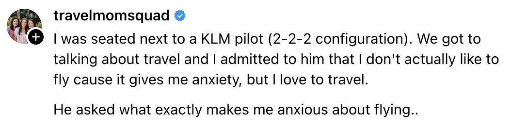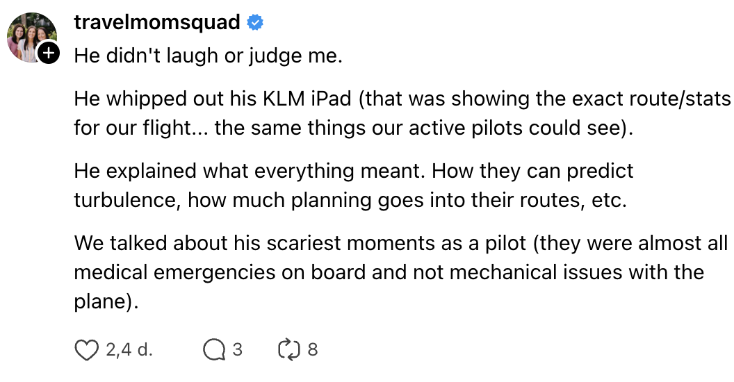 Waar sommige reizigers zonder erbij na te denken in een vliegtuig stappen, is dat voor andere best een big deal. Bijvoorbeeld als zij last hebben van vliegangst. Het maakt niet uit hoe vaak deze mensen te horen krijgen dat vliegen één van de veiligste manieren van reizen is en dat een beetje turbulentie erbij hoort: het blijft spannend. Déze reiziger stapt dan ook ietwat nerveus in een vliegtuig van KLM. Wanneer ze daar aan de praat raakt met een piloot, biecht ze haar vliegangst op. En daar weet hij gelukkig wel raad mee.