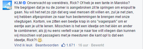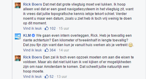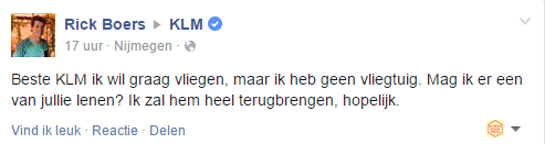 Tussen de vele vragen over vliegtickets en omboekingen die KLM dagelijks ontvangt, zit soms een heel brutaal verzoek. Rick uit Nijmegen wil graag een vliegtuig lenen. Dit antwoord van KLM uit 2015 stelt niet teleur. Het artikel is inmiddels door meer dan een miljoen mensen gelezen.