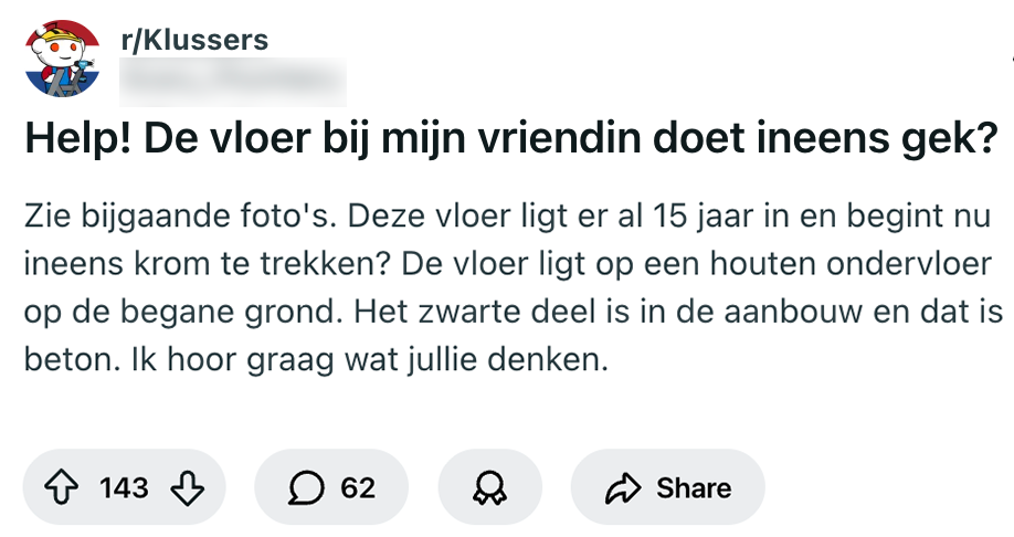 Als je net een woning hebt bemachtigd, is de kans groot dat de bodem van je spaarpot al bereikt is – zeker in de huidige woningmarkt. In zo’n situatie blijft een ‘verbouwing‘ vaak beperkt tot het hoognodige; de rest komt later (lees: nooit). De bewoner van dit huis heeft dan ook niets aan de vloer gedaan. Na een tijdje begint die vloer ineens ‘gek te doen’, als we de partner (die zich wel over het huis bekommert) moeten geloven. Maar zodra er foto’s worden aangeleverd, slaan anderen meteen de spijker op de kop.