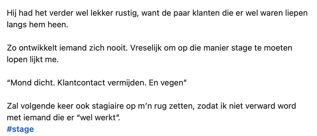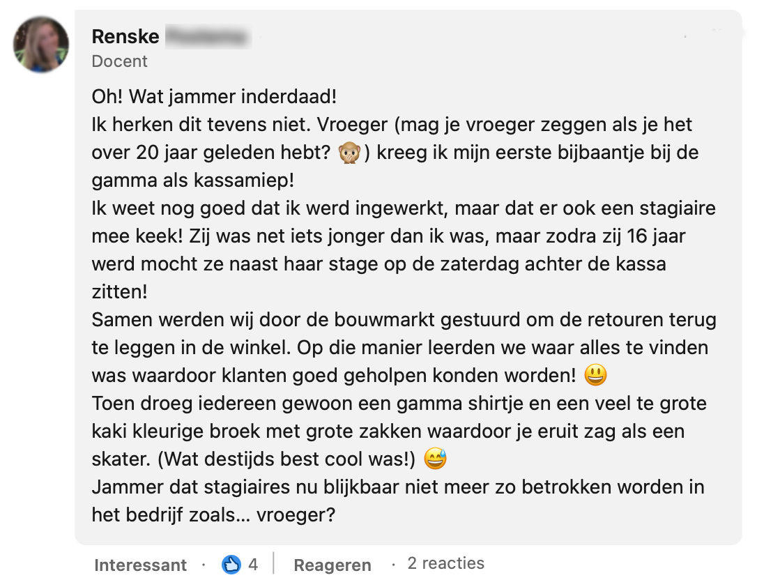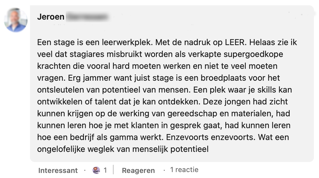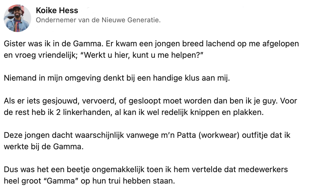 Wanneer je ergens stage gaat lopen, is het natuurlijk de bedoeling dat je veel leert. Koike liep rond in de Gamma toen hem iets opmerkelijks opviel. De stagiaires in de winkel droegen namelijk een shirt waar heel duidelijk op stond dat ze stagiair(e) zijn en dat klanten hun vragen aan een andere medewerker moesten stellen. Koike vindt daar iets van en deelt zijn verhaal op LinkedIn.