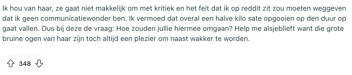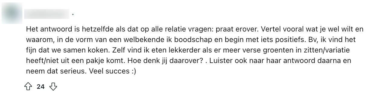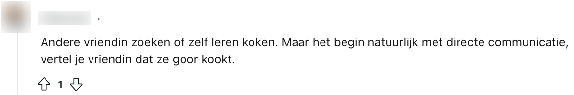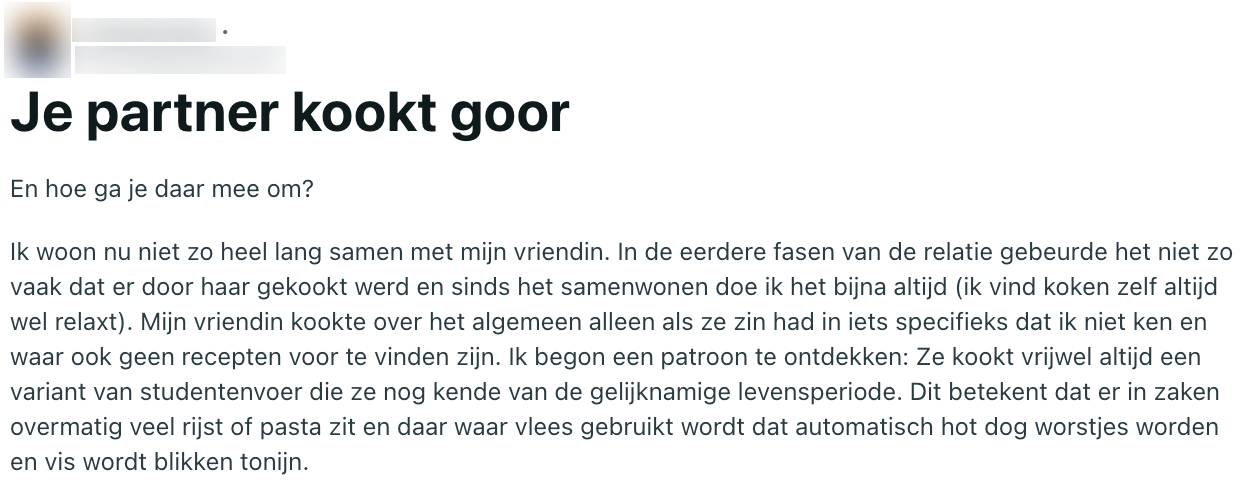 Dat we niet allemaal een Michelin ster verdienen voor onze kookkunsten, is natuurlijk helemaal niet erg. Het wordt pas een probleem als je dagelijks liters saus over je eten moet gooien, omdat het anders niet te vreten is. Of als je na elke maaltijd nog even langs de McDonald’s moet rijden om je honger te stillen. Wat de situatie al helemaal verschrikkelijk maakt als de kok in kwestie zelf het probleem niet zo ziet. Al helemaal als deze kok ook nog eens je partner is. Op Reddit vraagt iemand zich af hoe je subtiel aan je partner kan meedelen dat het gemaakte eten eigenlijk niet binnen te houden is. Anderen weten daar wel raad mee…