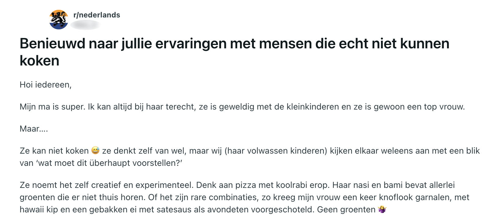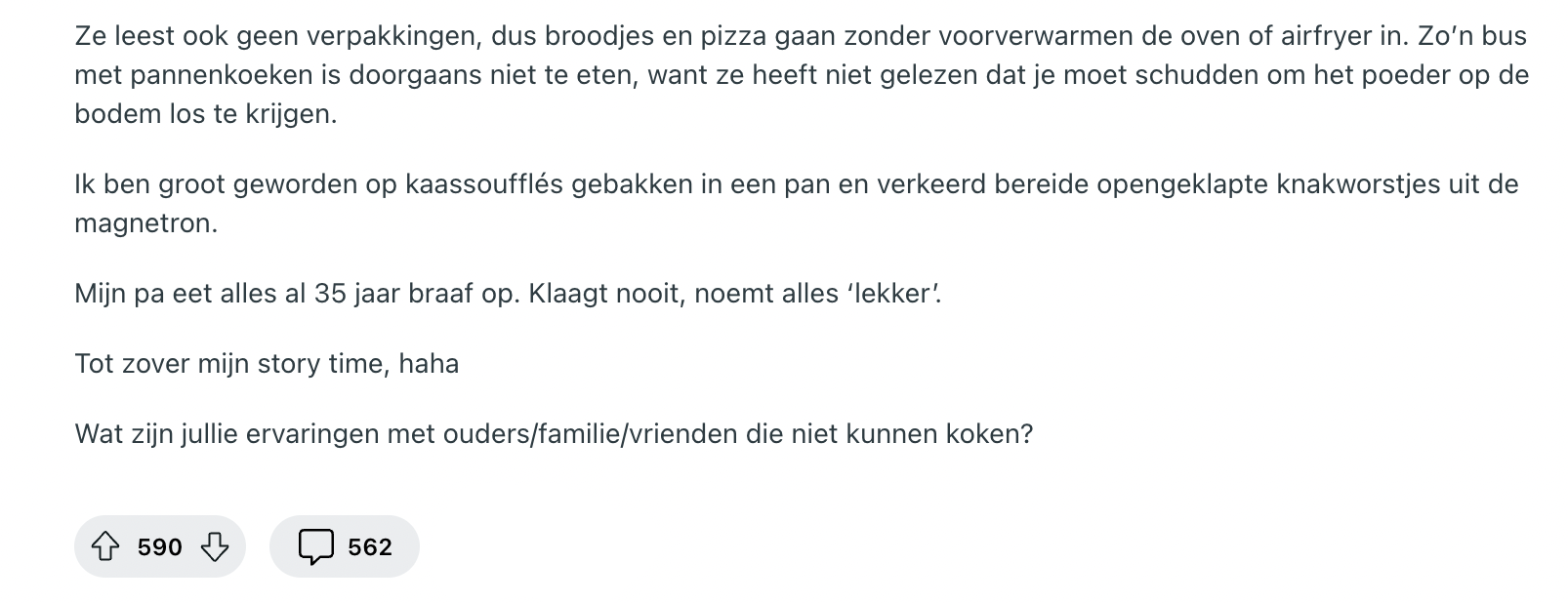 Waar de ene persoon zo de opvolger van Gordon Ramsey zou kunnen worden, helpen anderen zelfs een gebakken ei naar de gallemiezen. Eerlijk is eerlijk: koken is niet voor iedereen weggelegd. Een Reddit-gebruiker vraagt naar verhalen over Nederlanders die er helemaal niks van bakken in de keuken en krijgt een hoop reacties voorgeschoteld.