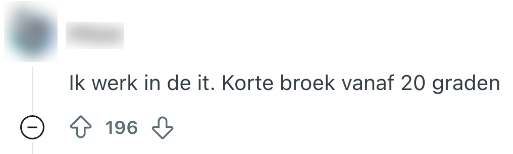 Nu het weer warmer wordt (of zeg maar gerust bloedheet), komt ook een oeroud dilemma weer boven: wel of niet een korte broek aan naar het werk. Je hoeft namelijk niet de hele dag naar de uitgezakte kont van Karin te kijken, maar het liefst smelt je zelf ook niet weg in je dikke spijkerbroek. Op Reddit is iemand helemaal de weg kwijt en vraagt andere Nederlanders om hulp, wat flink wat advies oplevert.