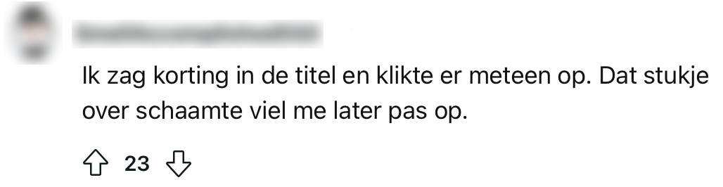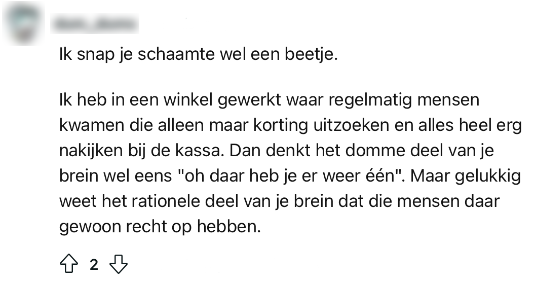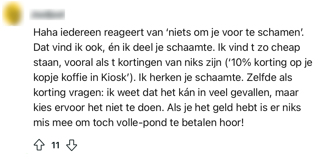Het is geen geheim dat Nederlanders koopjesjagers zijn en allesbehalve een gat in hun hand hebben. Ze zijn er dan ook als de kippen bij als er een uitverkoop is of als Black Friday weer om de hoek komt kijken. Maar wat blijkt: er bestaat ook zoiets als kortingsschaamte. Een Reddit-gebruiker voelt zich bezwaard als ‘ie gebruikmaakt van korting-deals in winkels en restaurants en vraagt zich af of anderen hier ook last van hebben. Uit de reacties blijkt dat mensen in ieder geval niet gierig zijn met het geven van hun mening.