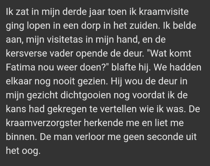 En dat is ons privilege. Dat wij kunnen stoppen met lezen als we er naar van worden, wij kunnen wegkijken. Dat kan niet als het je gebeurt.
