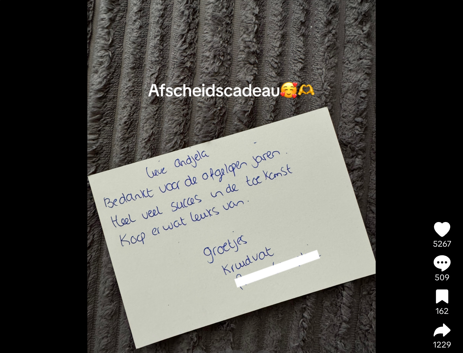 Dat het leven van een Kruidvat-medewerker niet altijd over rozen gaat, is intussen duidelijk. Zo moeten ze zich door ultra-smalle gangpaden wurgen én de hele dag het geschreeuw van de zelfscan aanhoren. Daarom besloot Andjela dat het na zeven jaar tijd was voor een nieuwe uitdaging. Hoewel je geen groot afscheidsfeest met champagne hoeft te verwachten, is een klein bedankje wel op z’n plaats. Maar het filiaal waar Andjela werkzaam was, neemt het woord ‘klein’ wel erg letterlijk…