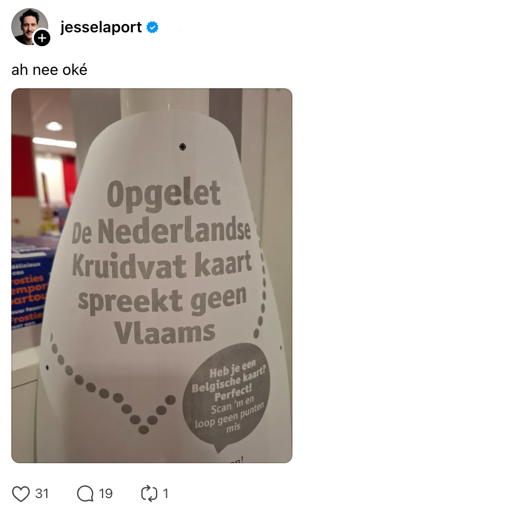Hoewel België en Nederland niet ver uit elkaar liggen, zijn er talloze verschillen tussen de twee landen. Vooral de taalbarrière kan voor moeilijkheden zorgen. Niet alleen Nederlanders hebben daar moeite mee, ook voor Kruidvat is het knap lastig om de twee landen te verbinden. Jesse spot een briefje waarmee Kruidvat de kloof tussen de twee volken probeert te dichten, maar dat lijkt averechts te werken.