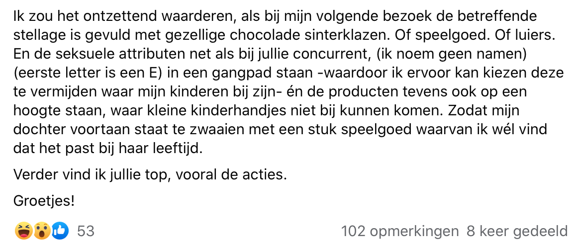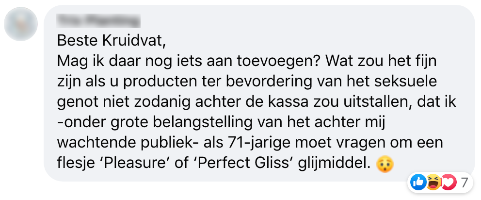 Soms denken we dat er over winkelindelingen niet goed is nagedacht, want “waarom zouden ze het op deze manier doen terwijl het ook anders kan?” Als je denkt dat je een idee hebt waardoor de winkel verbeterd kan worden, is dat voor de winkelier natuurlijk altijd fijn als je dit mededeelt. Zo deed ook deze klant dat, die het niet helemaal eens was met de plaatsing van een bepaald volwassen product.