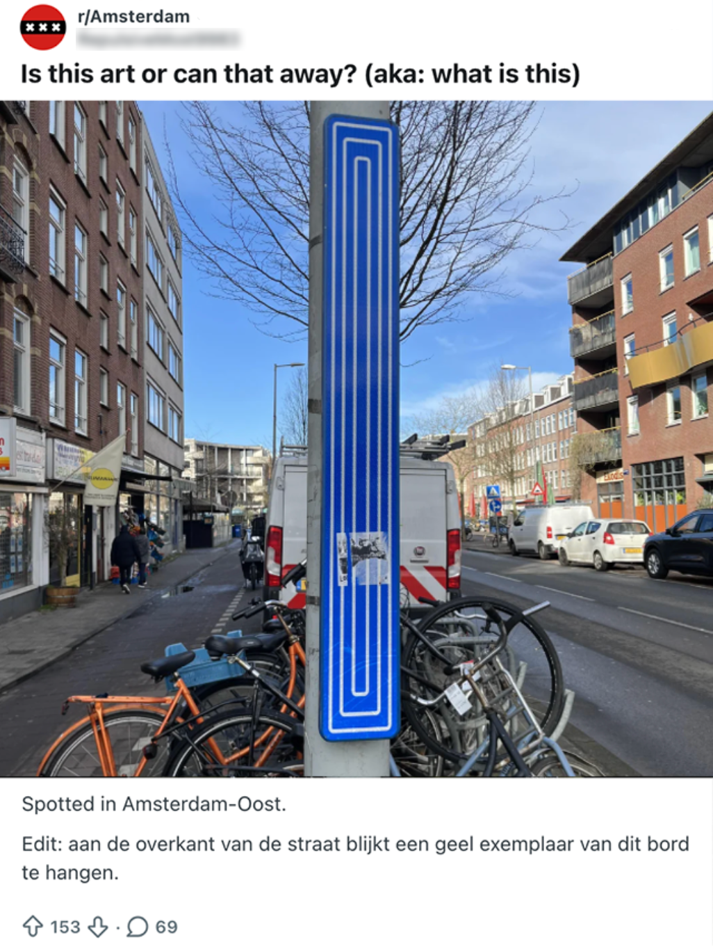 Is dit een kunstwerk van de welbekende kunstenaar Banksy, of gewoon een obscuur verkeersbord dat aangeeft welke route je moet rijden om Amsterdam te kunnen verlaten? In een stad waar straatkunst en straatregels gevaarlijk dicht bij elkaar liggen, is het verschil niet altijd meteen duidelijk. Voorbijgangers vertragen hun pas, knipperen drie keer met hun ogen en turen nog eens goed, maar begrijpen nog steeds niet wat dit bord precies bedoelt. Ze blijven verbaasd en een tikkeltje duizelig achter.