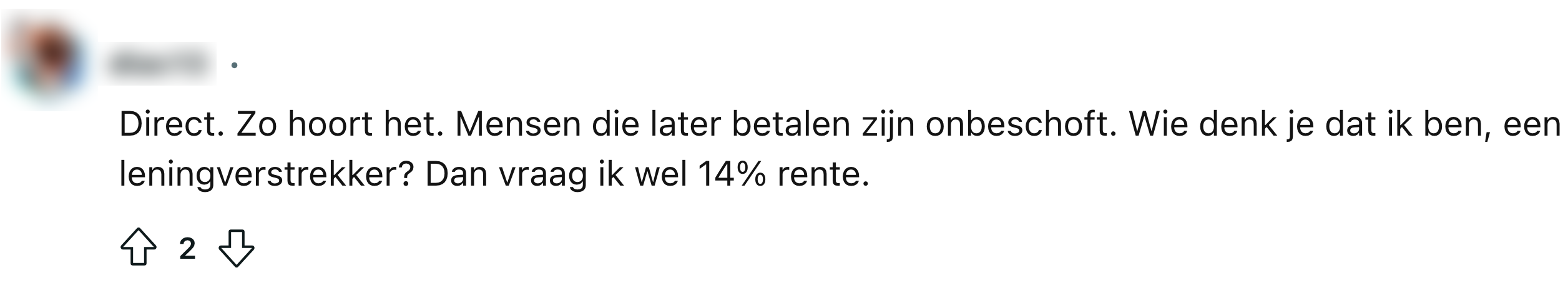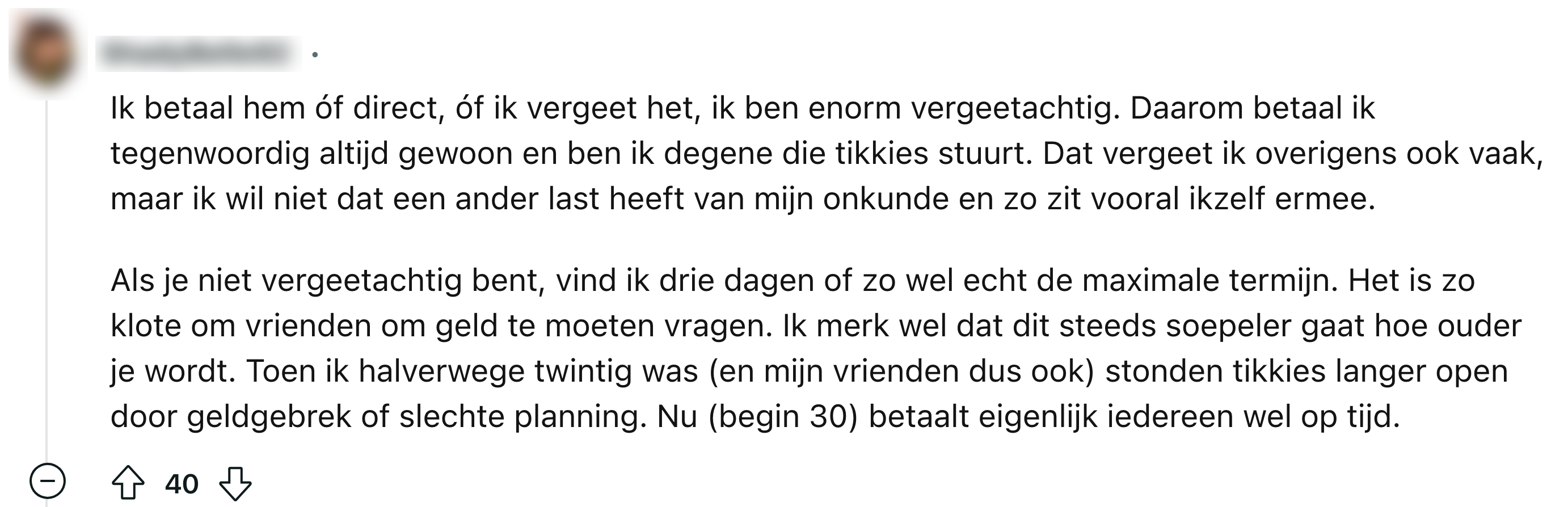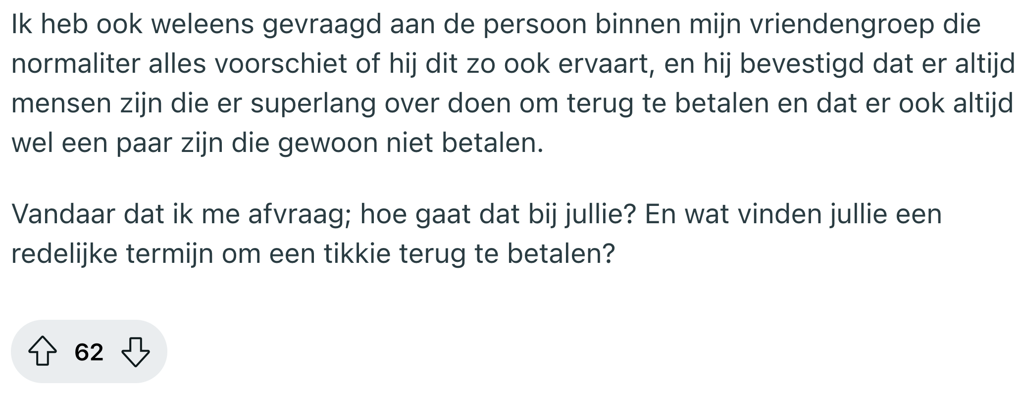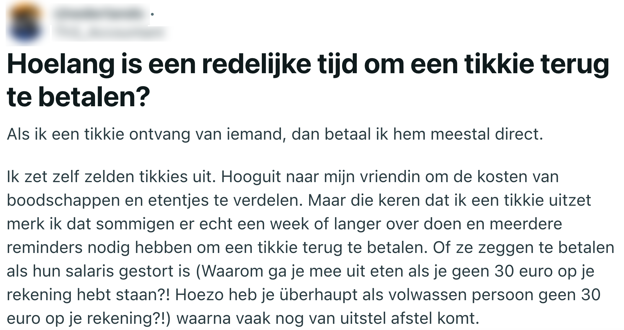 Als echte Nederlander moet je natuurlijk om ieder klein dingetje een Tikkie sturen die op de cent na berekend is. Het is wel fijn als deze Tikkies zo snel mogelijk betaald worden, want het zal je maar gebeuren dat je die 2 euro en 35 cent voor een patatje niet terugkrijgt. Op Reddit ontstaat een discussie over hoe lang je erover mag doen om een Tikkie te betalen – en mensen zijn niet te gierig om hun mening te delen