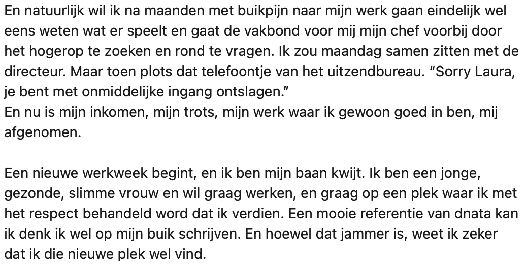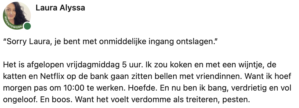 1. Laura deelde het vorige week al op Twitter. Een vervelend bericht over haar ontslag waarin ze ook vraagt om hulp zodat ze het kan aanvechten.