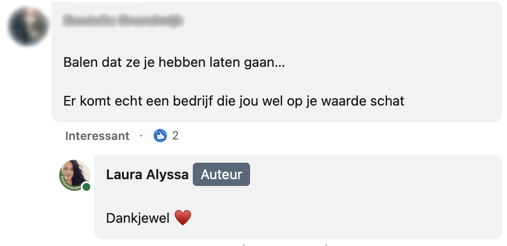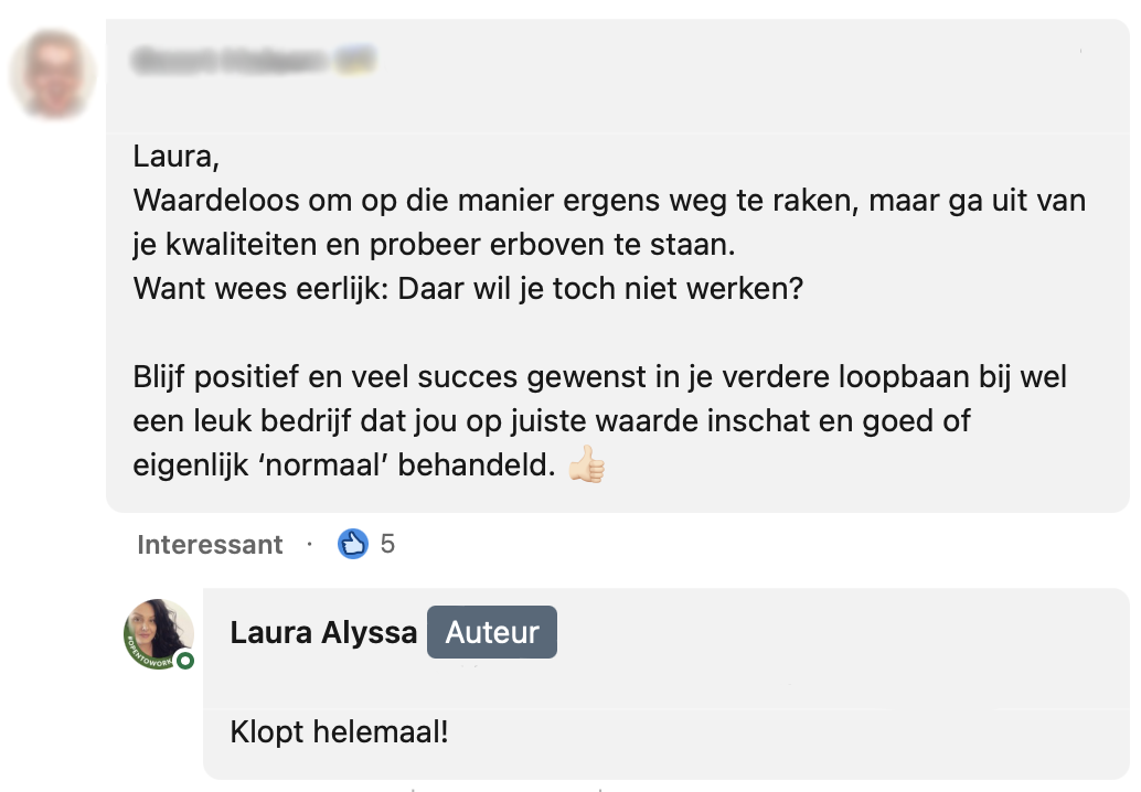 8. Toch is het grootste deel van de reacties er om Laura te steunen en helpen. Voordat we dit stuk afsluiten: Laura is momenteel nog druk met het afhandelen van het ongelukkige ontslag bij haar ex-werkgever. Echter is ze inmiddels ook al hard op zoek naar een nieuwe baan in België.