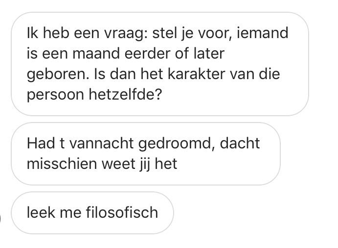 Sanne ten Wolde is filosoof, docent en fanatiek Twitteraar… en vooral dat alledrie tegelijkertijd. Ze geeft namelijk filosofieles en deelt graag de leukste momenten met haar leerlingen op Twitter. Zo deelt ze ook de filosofische vragen die haar leerlingen hebben. De vragen zijn simpel, maar je zou ze zelf niet snel bedenken. En bereid je vast voor: na het lezen van dit blog heb je heel veel vragen.