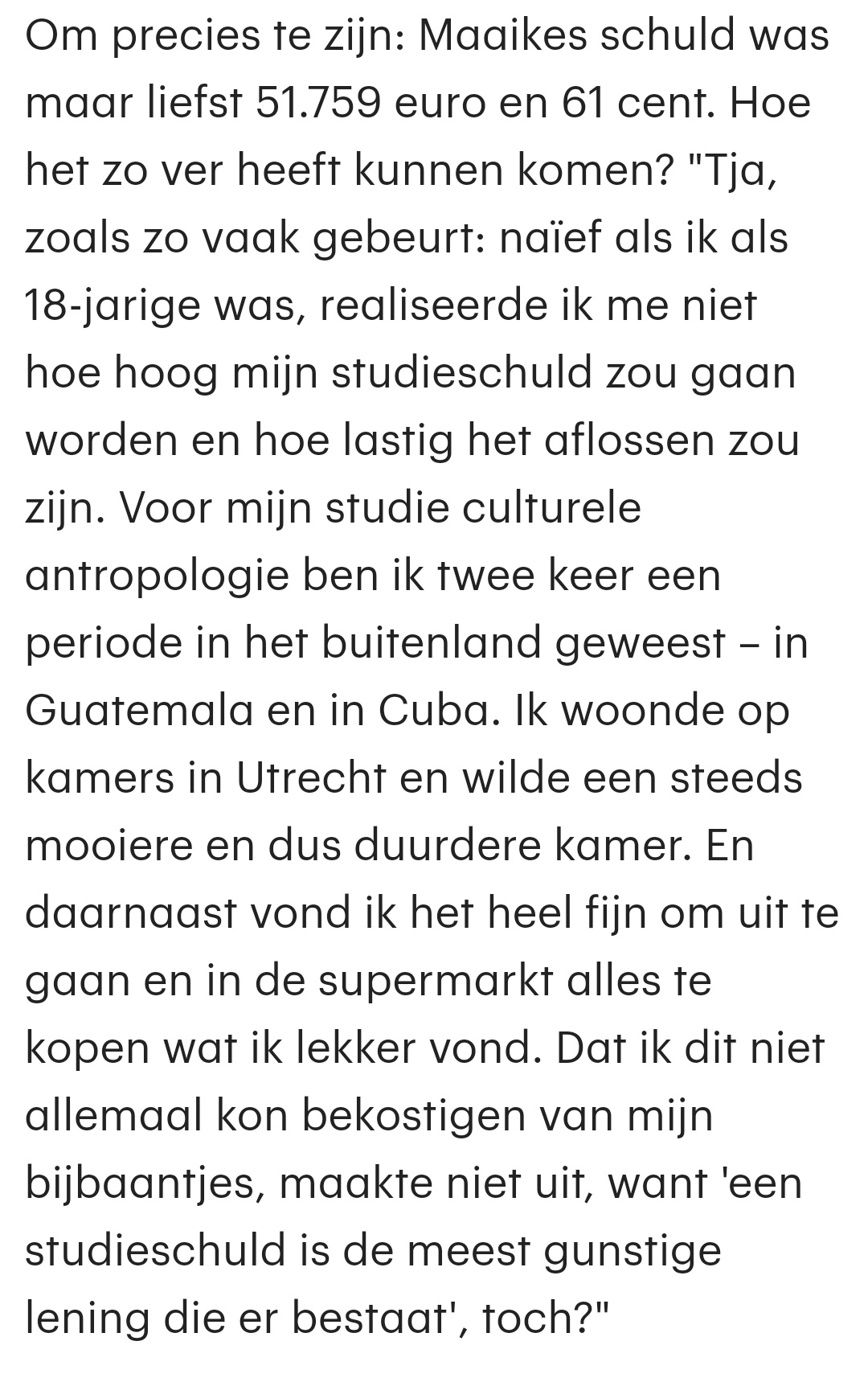 Dit terwijl lenen voor veel studenten een van de, zo niet de enige optie is om rond te komen. Super leuk voor Elena dat zij niet hoeft te lenen, maar dit is natuurlijk verre van representatief.