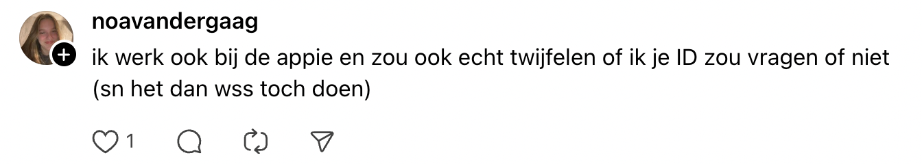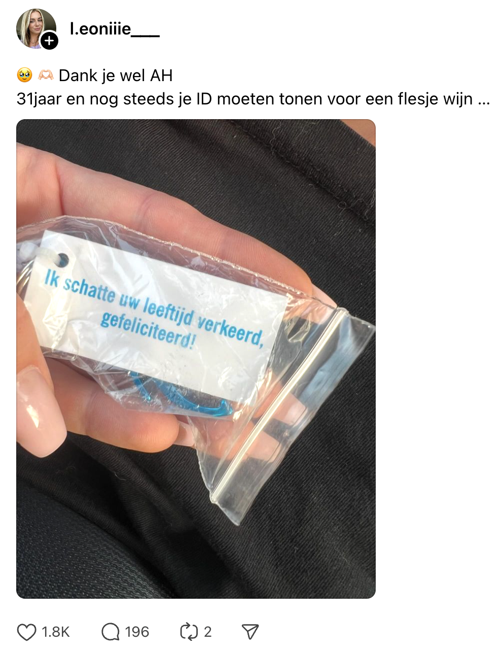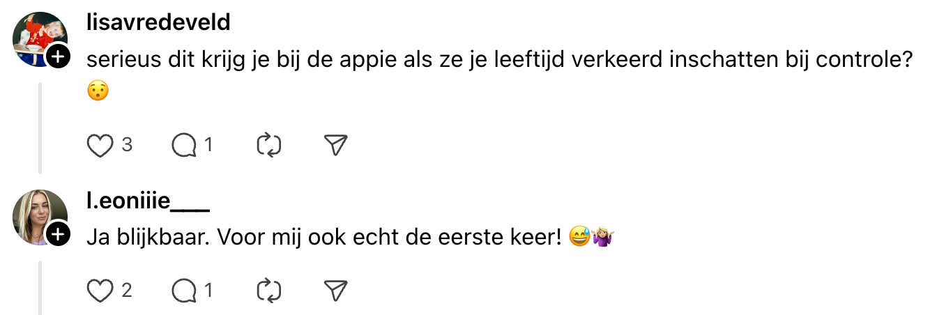 Ouder worden we allemaal. Waar de een de grijze haren en rimpels volledig omarmt, probeert de ander met wat botox het proces nog even te vertragen. Sommigen worden standaard jonger geschat. Zo wordt de 31-jarige Leonie tijdens een leeftijdscontrole bij Albert Heijn om haar ID-kaart gevraagd. Wanneer de medewerker erachter komt dat zij net effe wat ouder dan 25 is, krijgt Leonie een ludieke verrassing. En die zagen veel mensen niet aankomen.
