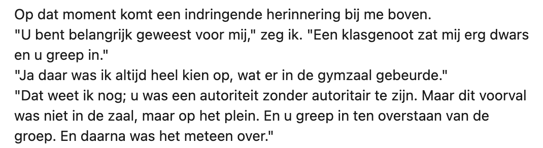3. De ontmoeting tussen de twee leraren brengt veel naar boven. De oud-docent heeft in de schooltijd van Bart voor een veilig gevoel gezorgd.