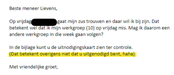 Wanneer je een keer niet aanwezig kon zijn bij een les, probeerde je jezelf altijd zo netjes mogelijk af te melden. Soms was het een terechte afzegging, maar soms was het verhaal zo hard uit je duim gezogen, dat je er bijna zelf in ging geloven. Johan is docent en ook hij kreeg een keurig mailtje in zijn mailbox. Een van zijn leerlingen kon een les niet volgen wegens een huwelijk. Waarschijnlijk wilde de student met harde bewijzen komen, zodat het niet werd afgedaan als smoes. Daarom werd de uitnodiging ook maar effe meegestuurd. Helaas voor Johan werd direct duidelijk dat dit NIET betekende dat hij ook welkom was.
