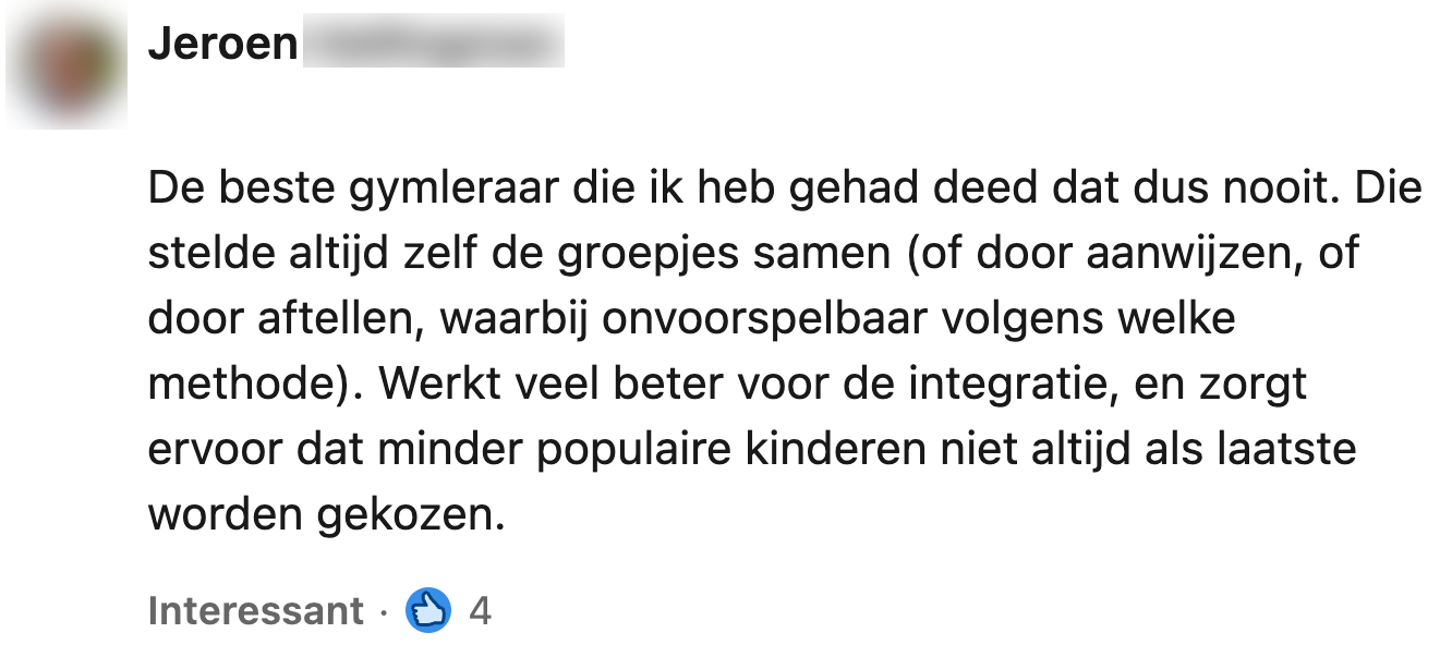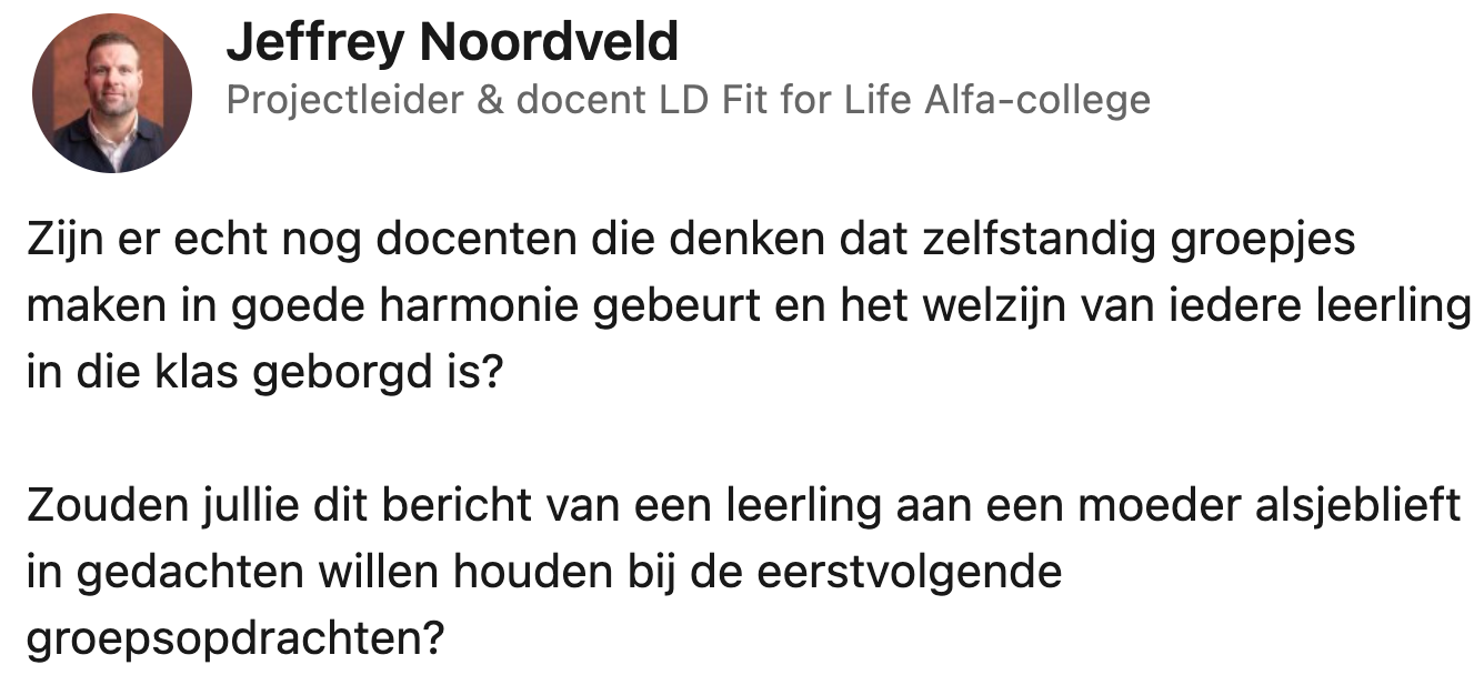 Terwijl de hele klas in de gymzaal luidkeels aan het kakelen is over wie er zal winnen met trefbal, zijn er vaak een paar kinderen die zwetend op de bank zitten, in de hoop dat ze niet als laatste worden uitgekozen. Deze vervelende situatie komt helaas vaker voor tijdens het vormen van groepjes – en niet alleen bij gym. Docent Jeffrey deelt een verdrietig WhatsApp-gesprek van een leerling en hoopt daarmee aan te tonen dat het geen goed idee is om scholieren zelf groepjes te laten maken.