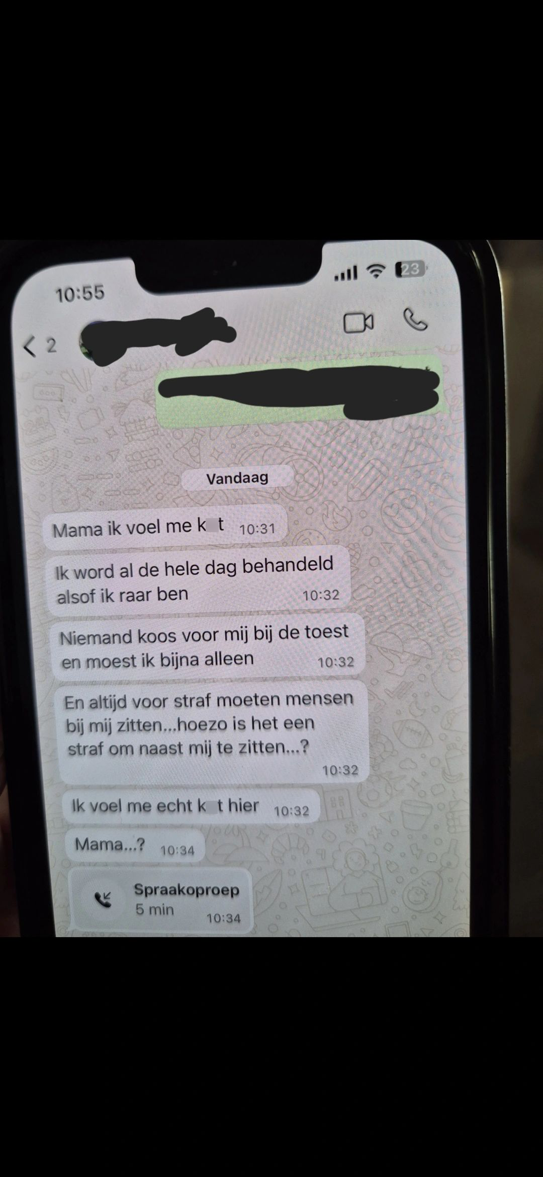 1. Jeffrey ziet dit verdrietige WhatsApp-gesprek van een leerling en besluit het online te delen.