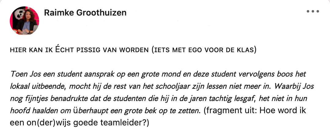 1. Raimke geeft een mooi voorbeeld van een leraar die is blijven hangen in de jaren tachtig, met alle gevolgen van dien.