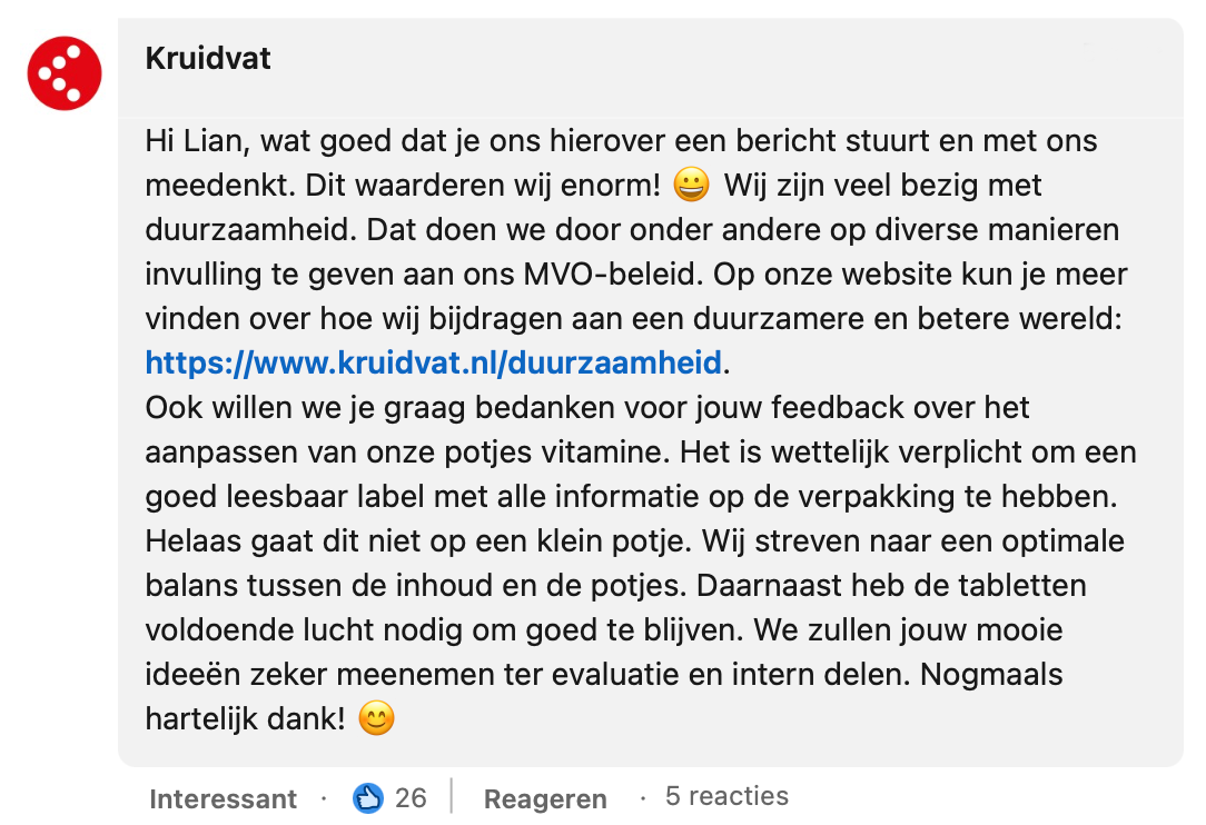 7. Kruidvat zelf reageert ook op het voorstel van Lian. Je zou denken wat in het (kruid)vat zit verzuurt niet, maar dat is bij Vitamine D-pilletjes dus wél het geval als ze te weinig lucht krijgen.