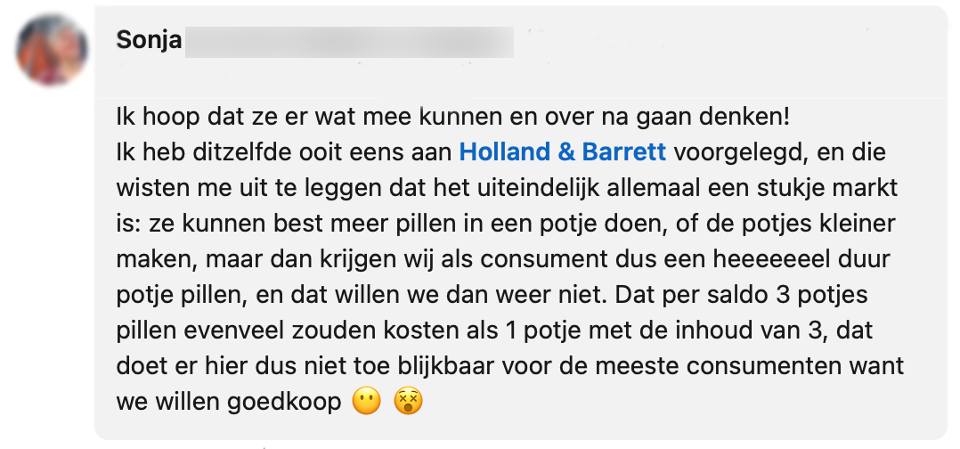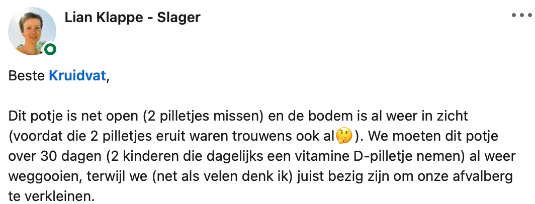 Je kan jezelf vastplakken aan een schilderij om aandacht te vragen voor het milieu, maar je kan ook wat kleiner beginnen. Lian koopt regelmatig voor haar kinderen Vitamine D-pillen bij Kruidvat en ze schrok van de inhoud van deze potjes. Een handje vol tabletten zit namelijk in een enorme verpakking. Ze besluit daarom aan de bel te trekken en aan Kruidvat te vragen of dit niet effe anders kan. Alle kleine beetjes helpen (en kleinere potjes ook).