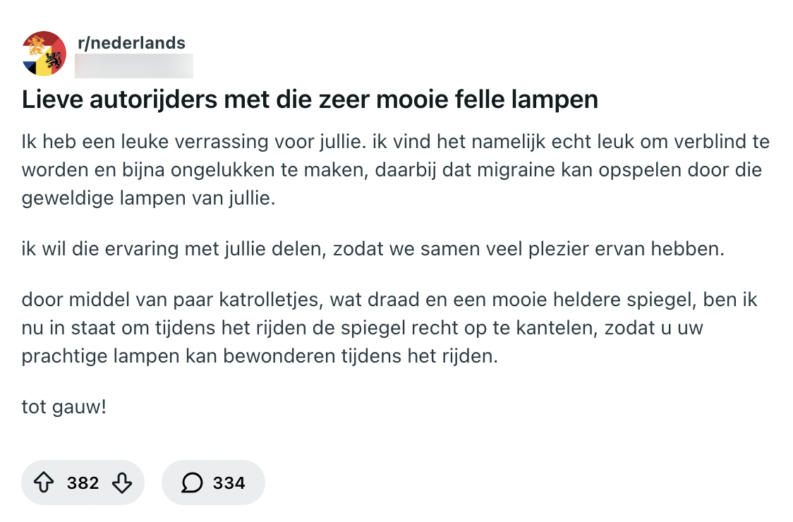Het is donker, het is druk, je probeert je ogen op de weg te houden en dan word je verblind door de felle koplampen van een tegenligger. Die dingen zijn zó heftig dat je effe denkt dat je recht in een TL-lamp kijkt. Groot licht? Verkeerd afgestelde lampen? Of gewoon onverschilligheid? Voor deze bestuurder is de maat helemaal vol. Op Reddit deelt-ie diens frustratie, en al snel blijkt dat meer mensen zich kapot ergeren.