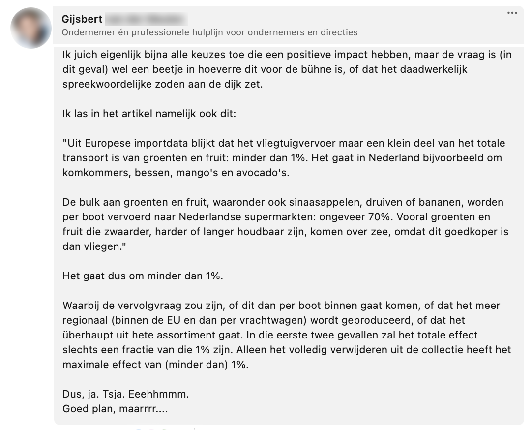 Vergeet niet de enorme hoeveelheid gas die we verstoken in sommige kassen. Het is niet zo simpel als “per vliegtuig vervoerd dus slecht”. De vraag is hoe krijgen we inzicht in de totale energie en CO2 productie die een product gekost heeft. En we gooien zelf zo’n 30% weg.
