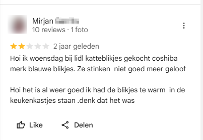 Mensen laten om de meest aparte redenen een review achter over een bedrijf. Zo is die ene leerling ontevreden met zijn onvoldoende op Magister en geeft hij de school daarom één ster, en vindt een hotelgast dat de handdoeken niet op de goede plek liggen. Hup, twee sterren. Mirjan wilde een negatieve review achterlaten over het kattenvoer van Lidl, maar komt daar opvallend snel op terug…