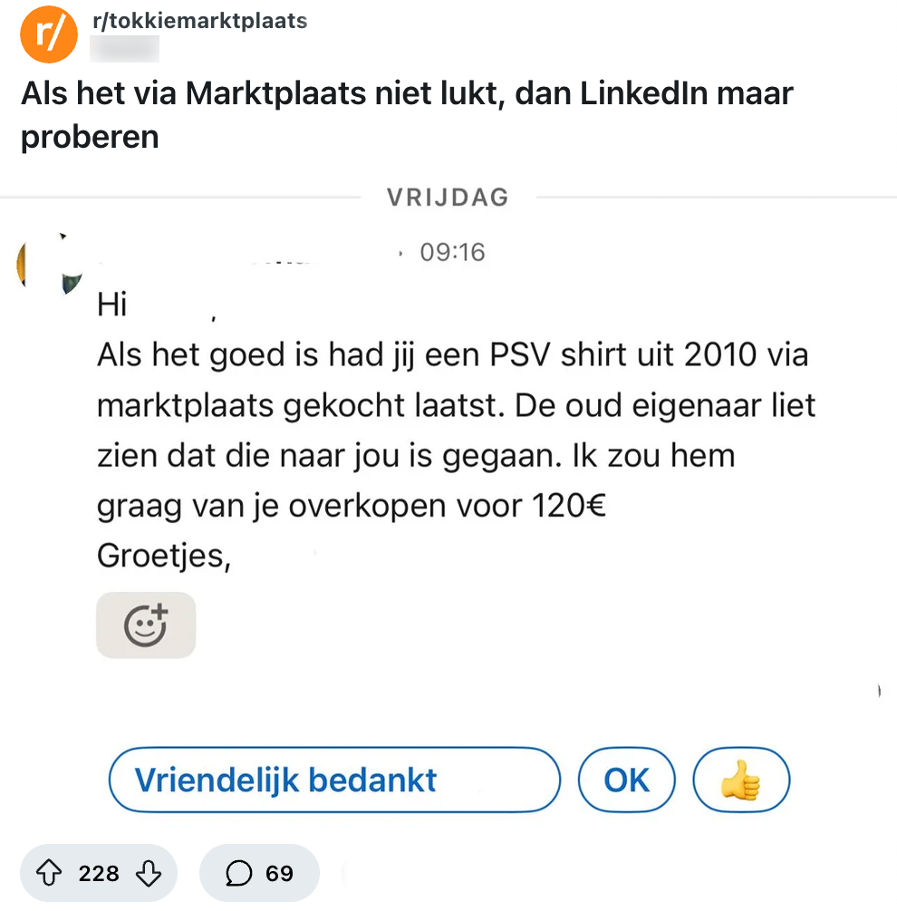 Als je aan LinkedIn denkt, gaan je gedachten gelijk richting professioneel gedrag: bedrijven die hun jaarlijkse verslagen publiceren, vacatures die worden gedeeld en afgestudeerde studenten die al hun docenten bedanken in een post van twaalf alinea’s lang. Maar blijkbaar wordt het platform niet alleen gebruikt voor professionele zaken. Een LinkedIn-gebruiker krijgt namelijk een vreemd bericht over een PSV-shirt, dat duidelijk op een ander platform thuishoort