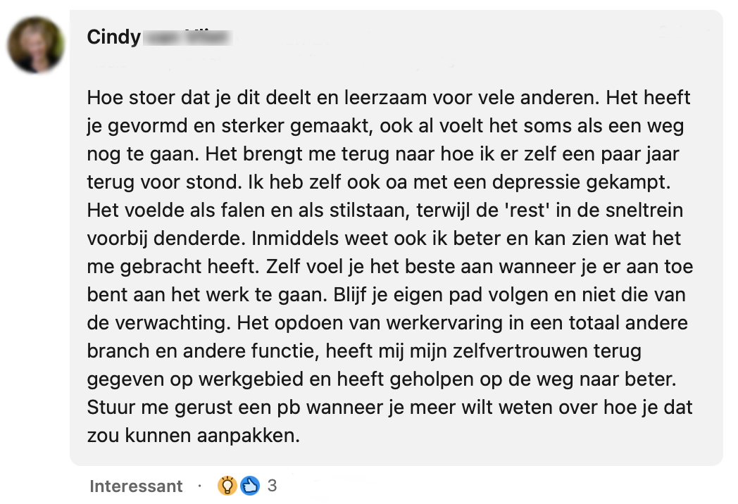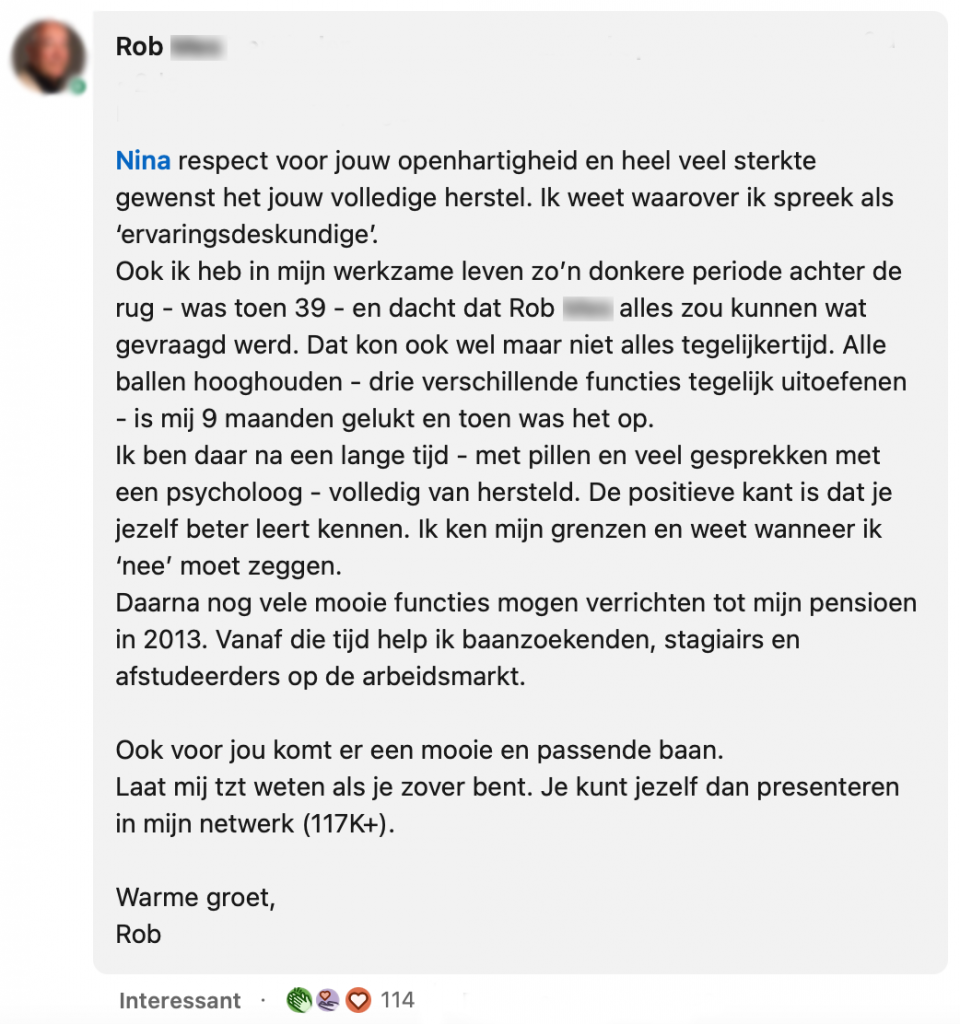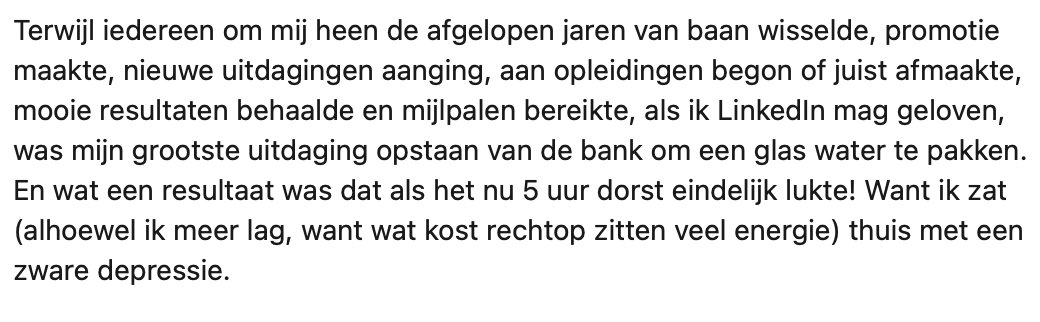LinkedIn is een plek waar mensen vaak hun successen delen of op zoek zijn naar een volgende stap. Nina besloot om eens een heel ander geluid te laten horen. De mensen binnen haar netwerk delen het ene na het andere hoogtepunt, waardoor het idee heerst dat het altijd alleen maar goed moet gaan. Nina deelt dat ze door haar depressie wellicht niet per se enorme stappen heeft gemaakt in haar carrière, maar juist wel op persoonlijk vlak. Ze benadrukt dat openheid over je mentale gezondheid, juist in deze tijd, hartstikke belangrijk is.