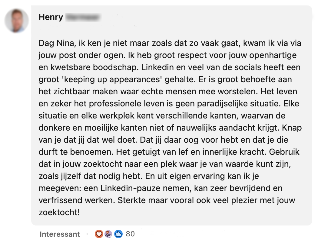 7. Uit de reacties blijkt dat sommigen het ook eens zijn met Nina’s kijk op LinkedIn. Volgens Henry is het dan ook goed om soms even een ‘LinkedIn-pauze’ in te voeren.