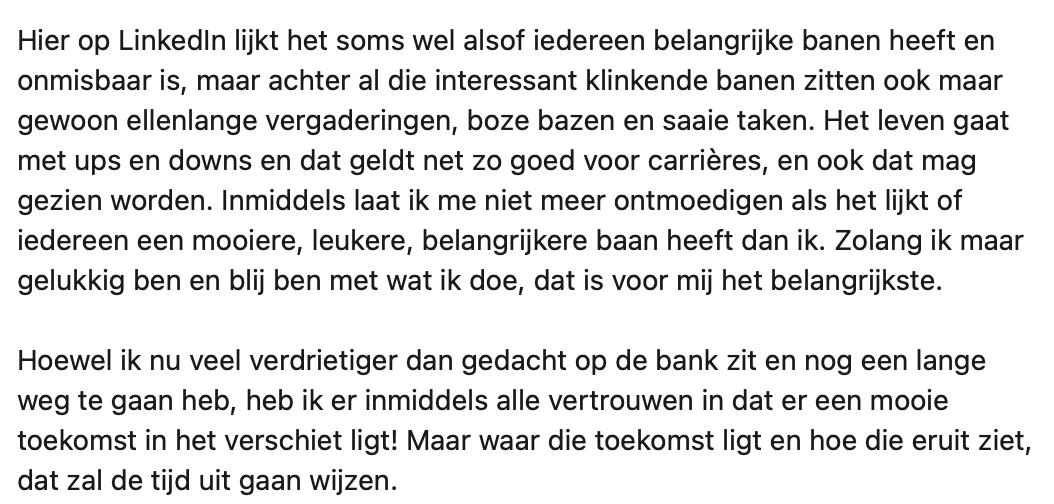 8. Ook is het belangrijk dat iedereen zich beseft dat achter de mooie verhalen op LinkedIn ook vaak andere emoties en ervaringen schuilen.
