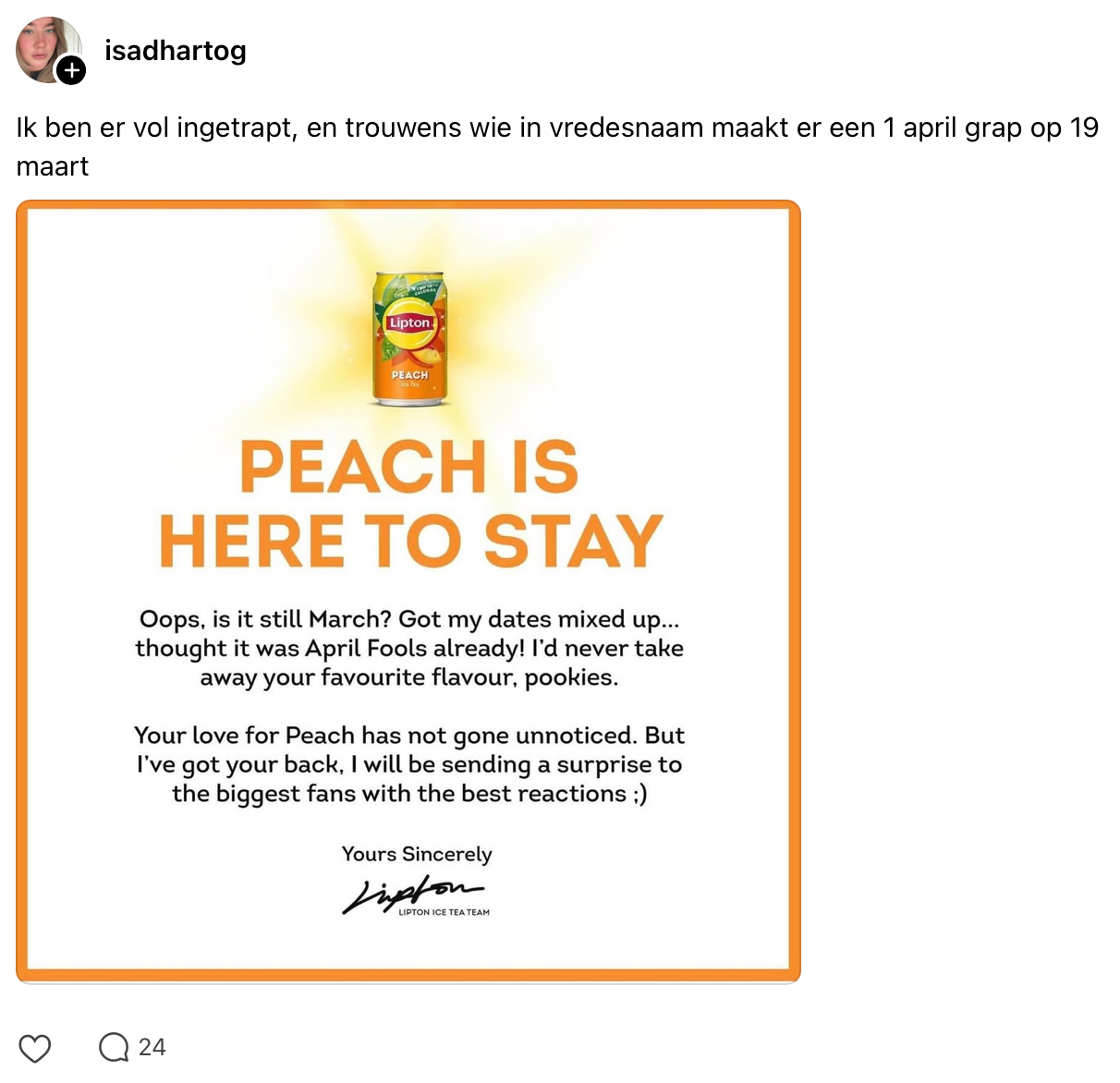De zon komt tevoorschijn en de terrasjes openen, dus we genieten de komende massaal van een verfrissend drankje. Maar als Ice Tea Peach jouw standaard keuze is, heeft Lipton misschien minder goed ‘nieuws’ voor je. Gisteren kondigde het merk op social media aan dat deze populaire smaak uit de schappen zal verdwijnen. Een flinke domper voor de liefhebbers, maar niet iedereen is ervan overtuigd dat het klopt. Moeten mensen daadwerkelijk afscheid nemen van de smaak, of is dit gewoon een ijzersterke 1-aprilgrap? De wereld is sceptisch.