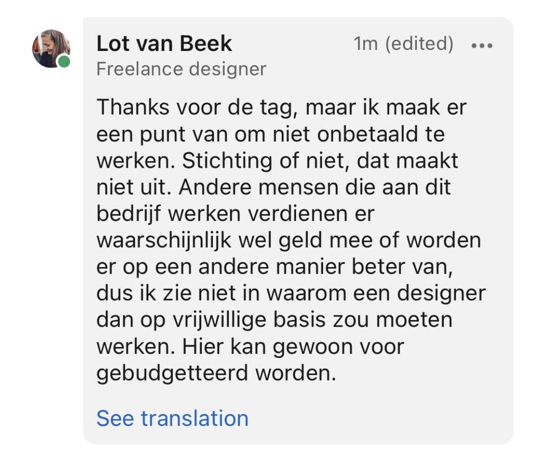 Het gebeurt regelmatig dat een stichting of bedrijf een oproep doet met de vraag of mensen op vrijwillige basis mee willen werken aan een project. Aan de ene kant kan dit zeker geen kwaad, maar anderzijds is het begrijpelijk dat sommigen die dit soort verzoeken krijgen zich afvragen waarom de één op vrijwillige basis moet werken en een ander gewoon betaald krijgt. Zo ook Lot, die zich uitspreekt over dit soort ‘gratis werk‘ verzoeken van instanties.